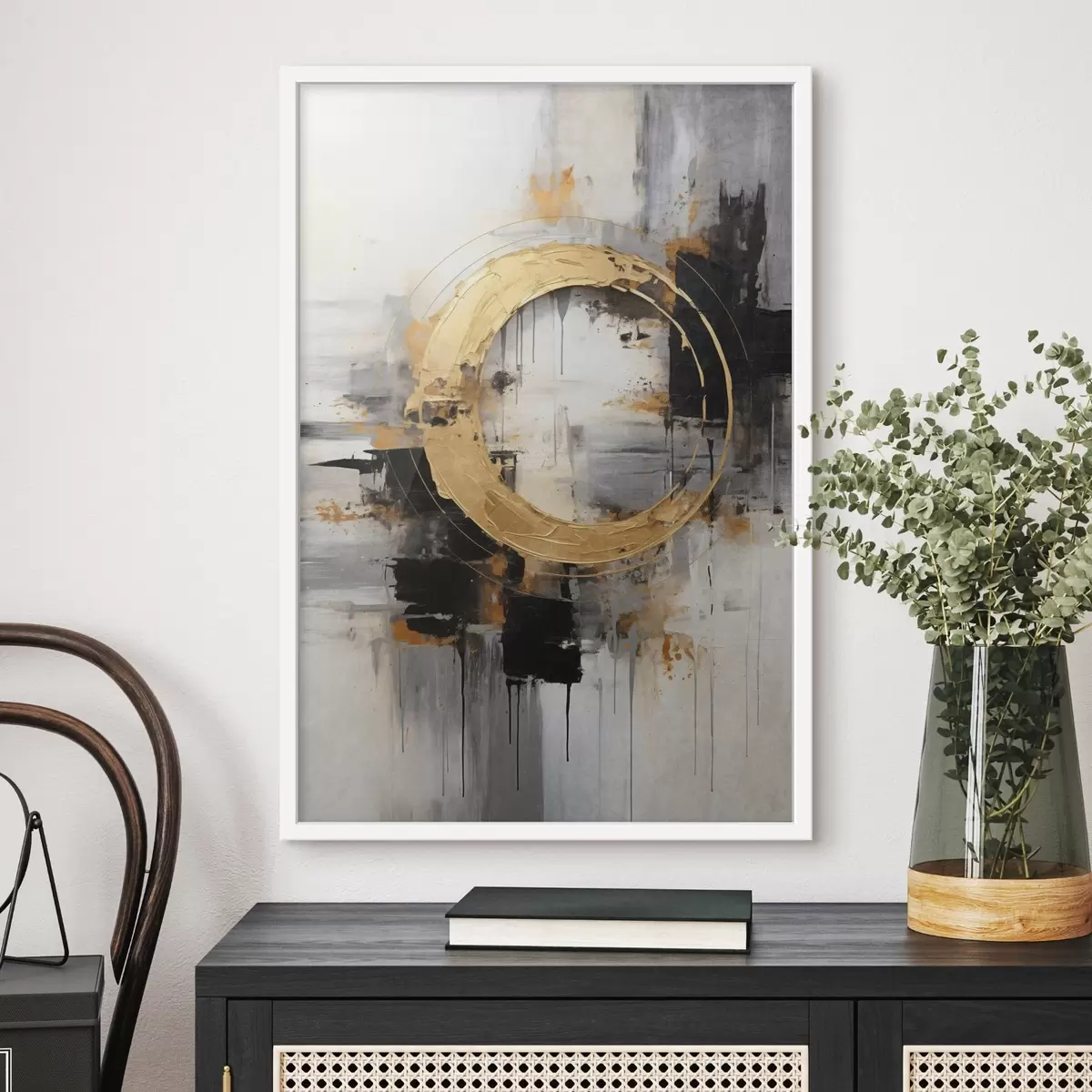 Poster Cuadro abstracto con círculos, líneas negras y amarillas, y un fondo con tonos grises y blancos f45186