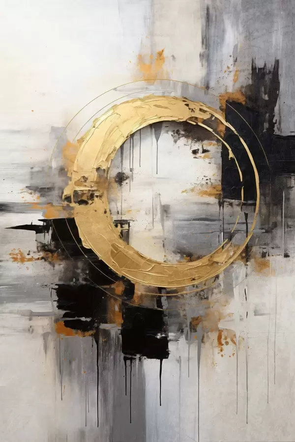 Poster Cuadro abstracto con círculos, líneas negras y amarillas, y un fondo con tonos grises y blancos Nr f45186