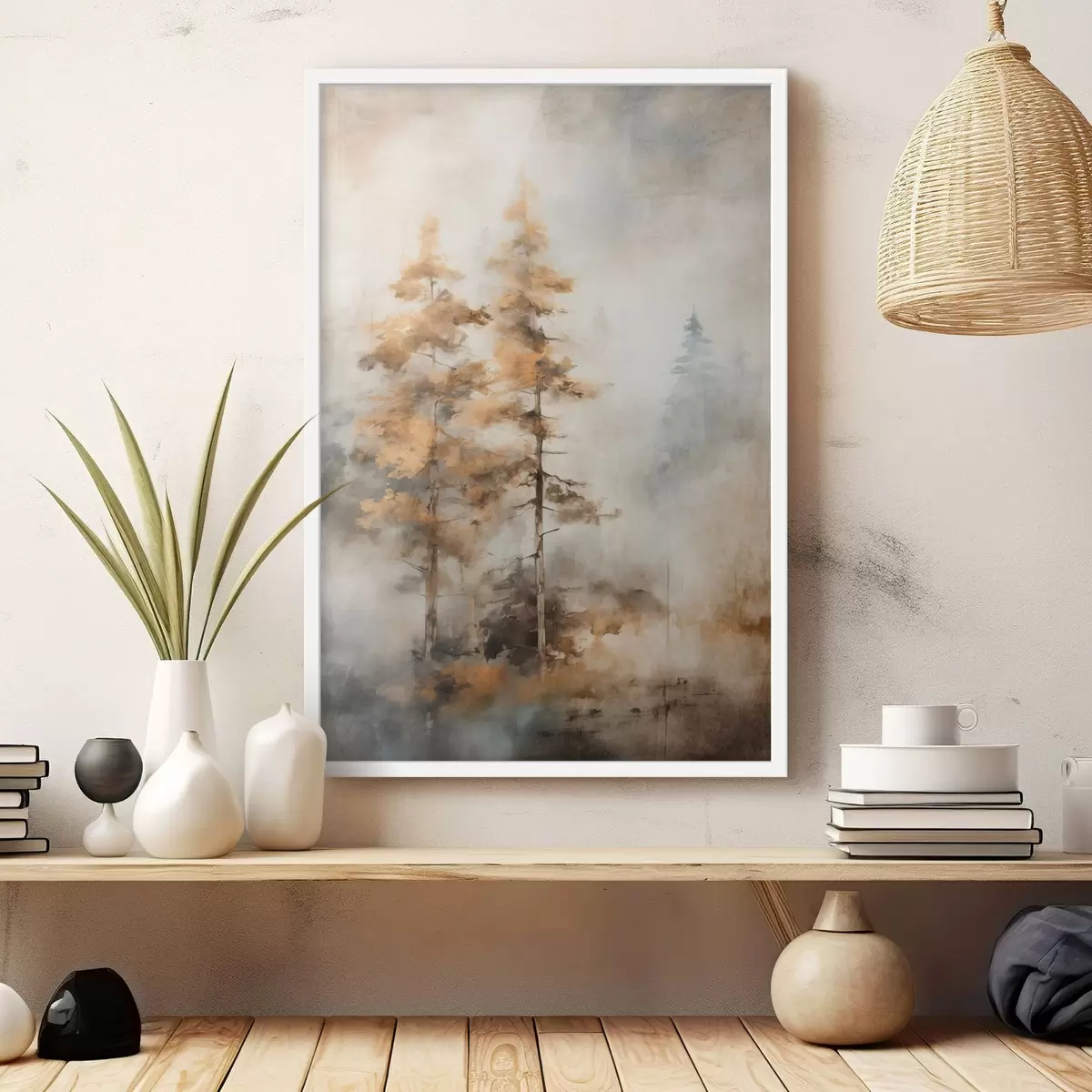 Poster Árboles altos con textura y hojas amarillas en un bosque , el fondo es una mezcla de suaves tonos azules y marrones Nr f45188