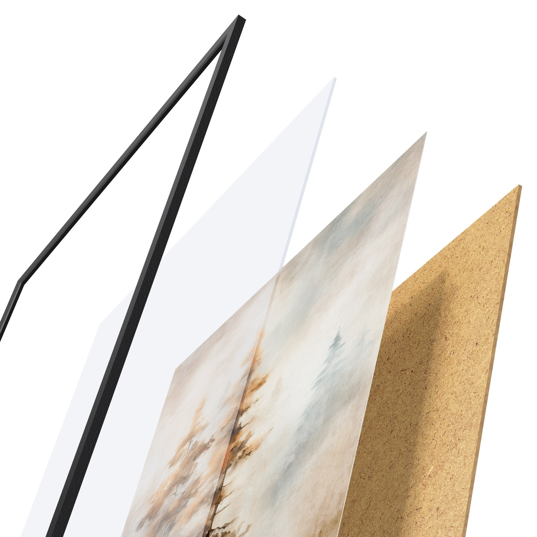 El póster consta de marco, plexiglás, imagen impresa y soporte de aglomerado. El póster puede colgarse inmediatamente en la pared gracias a los soportes de la parte posterior.