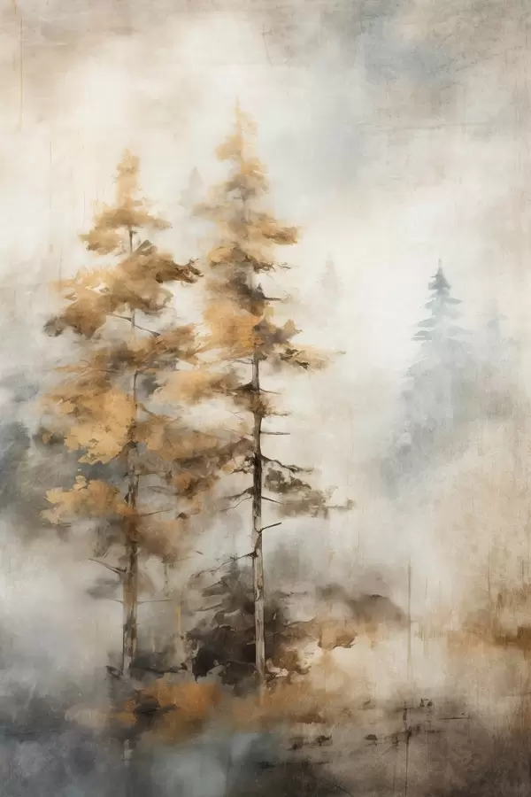 Poster Árboles altos con textura y hojas amarillas en un bosque , el fondo es una mezcla de suaves tonos azules y marrones Nr f45188