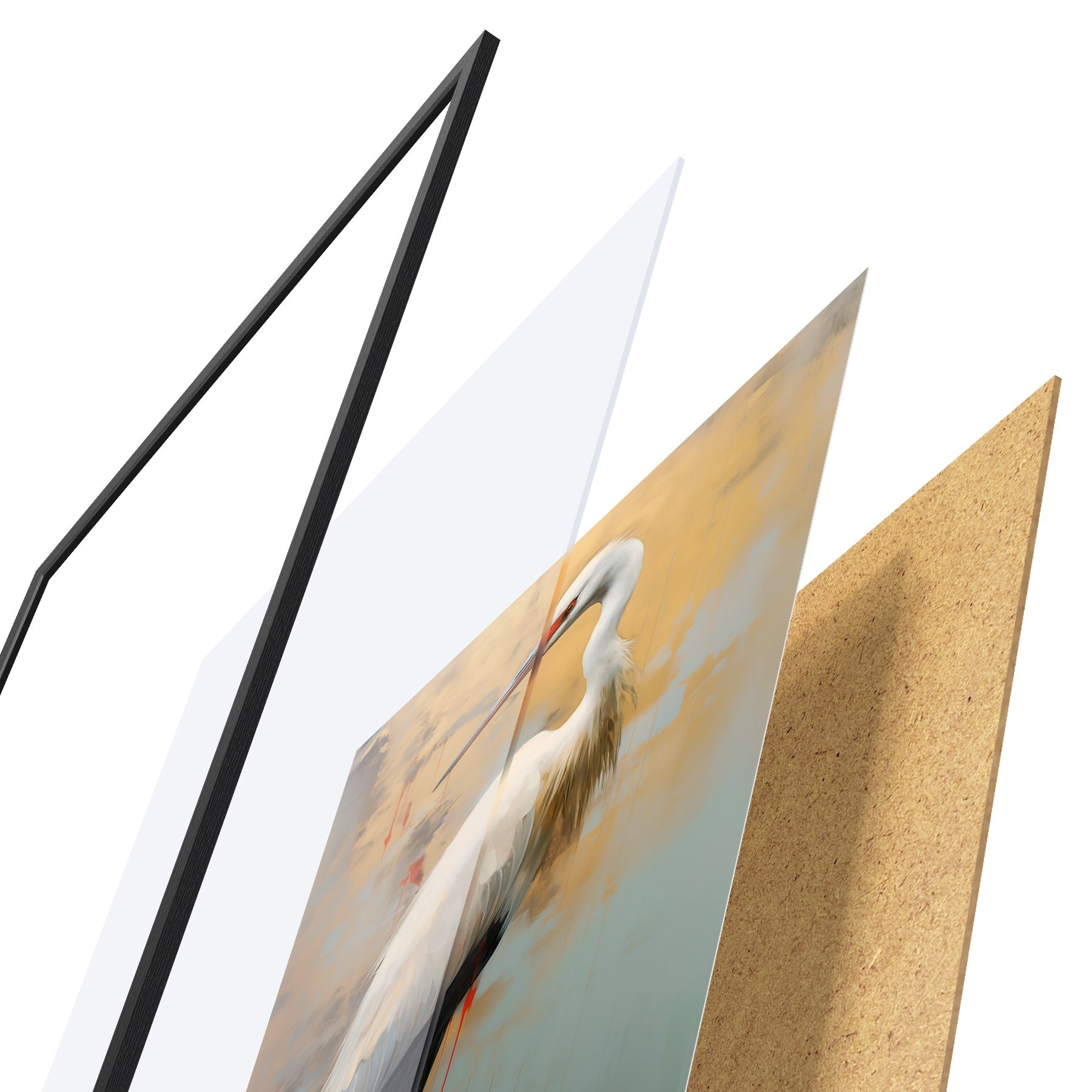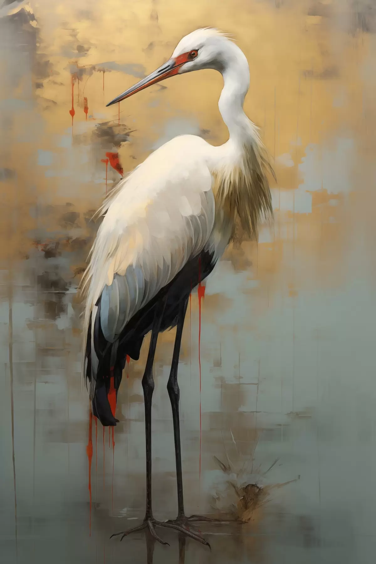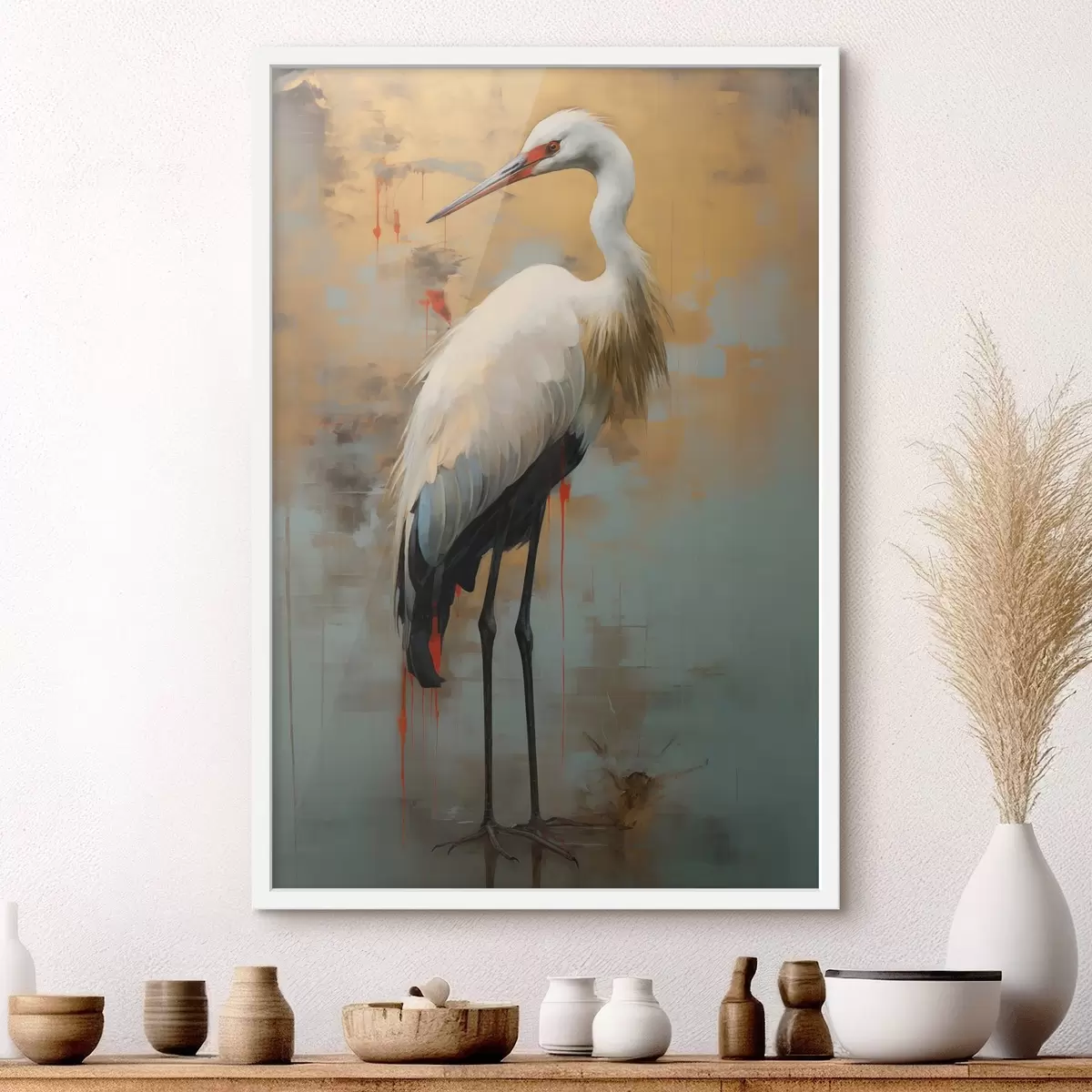 Poster Garza blanca sobre un fondo de tonos amarillos, marrones y azules apagados que sugieren un paisaje brumoso y abstracto Nr f45191