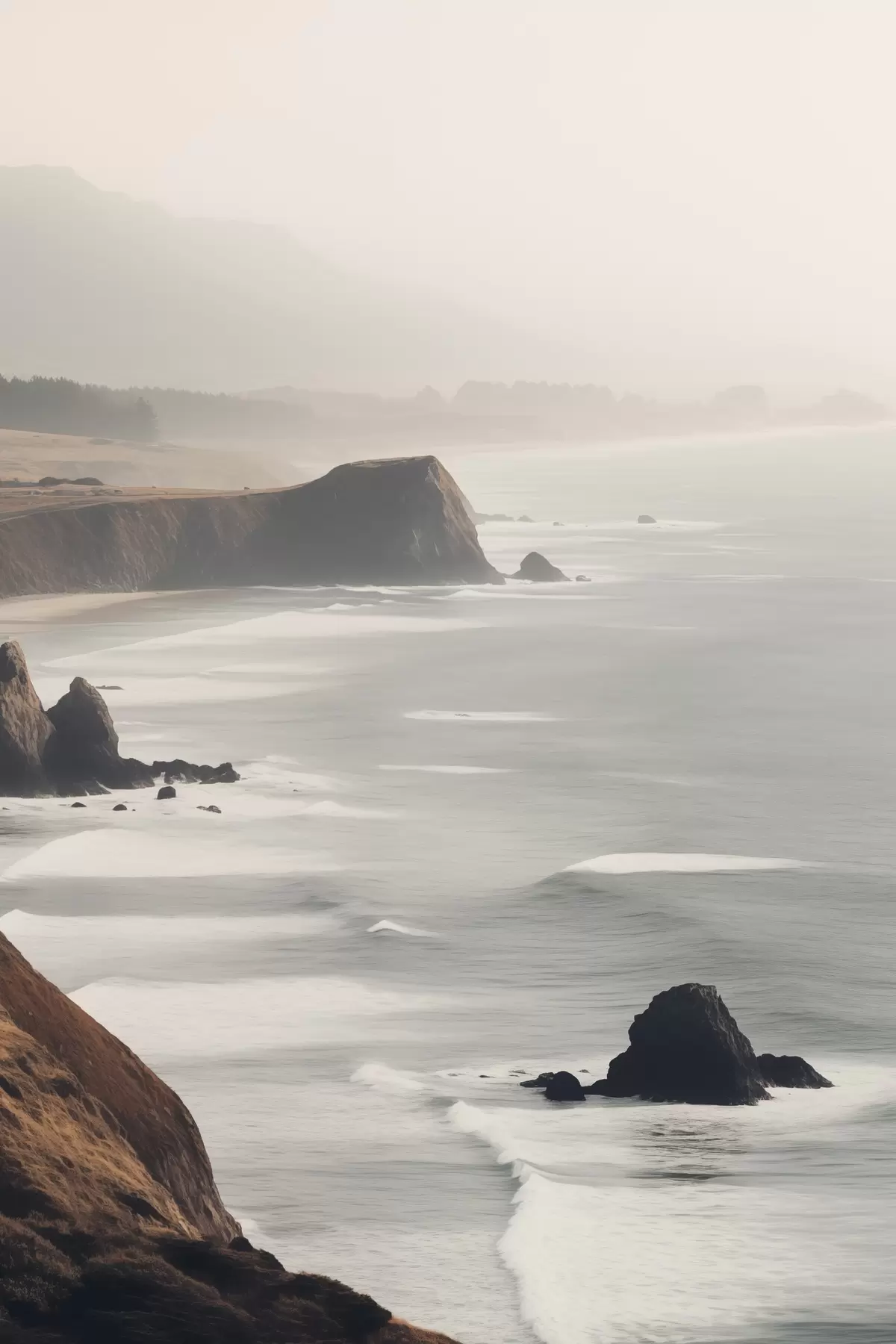 Poster Acantilados rocosos y litoral marino, olas rompiendo en la orilla, paisaje con una atmósfera malhumorada, tonos terrosos f45194