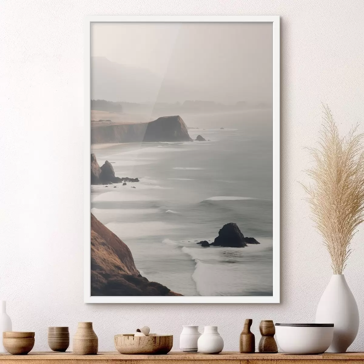 Poster Acantilados rocosos y litoral marino, olas rompiendo en la orilla, paisaje con una atmósfera malhumorada, tonos terrosos Nr f45194