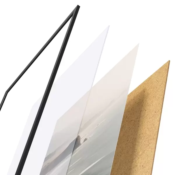 El póster consta de marco, plexiglás, imagen impresa y soporte de aglomerado. El póster puede colgarse inmediatamente en la pared gracias a los soportes de la parte posterior.