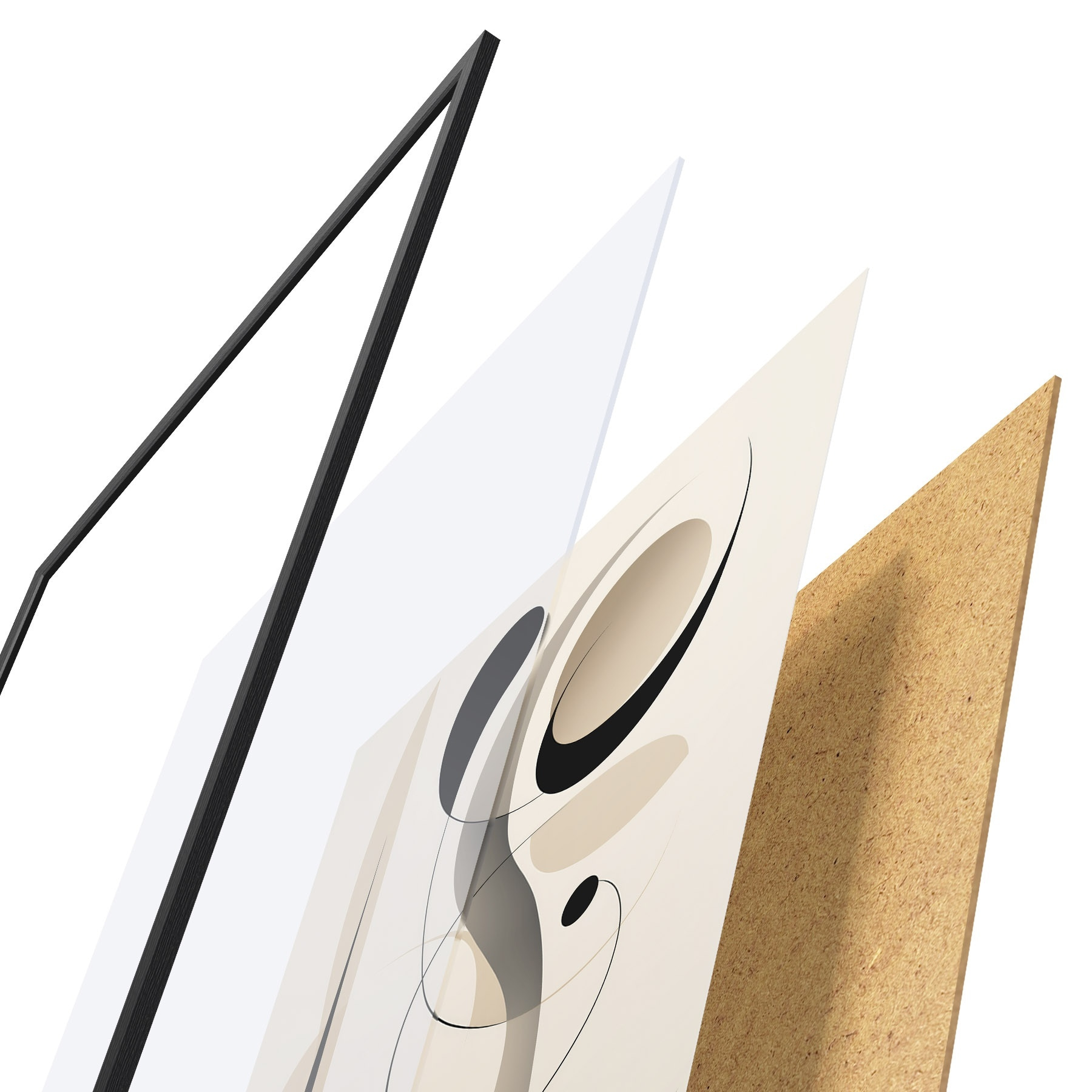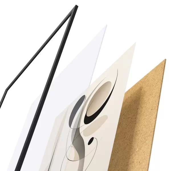 El póster consta de marco, plexiglás, imagen impresa y soporte de aglomerado. El póster puede colgarse inmediatamente en la pared gracias a los soportes de la parte posterior.