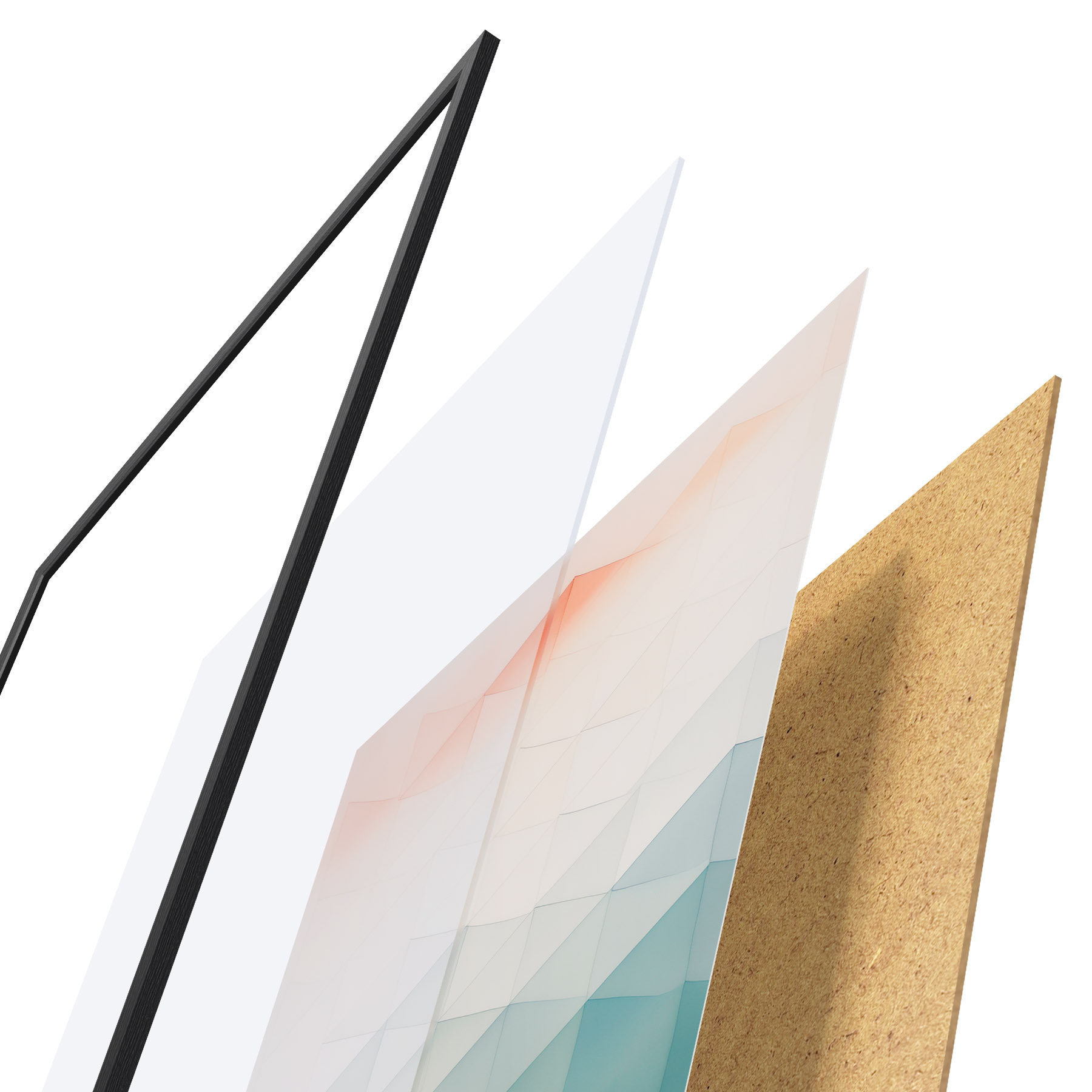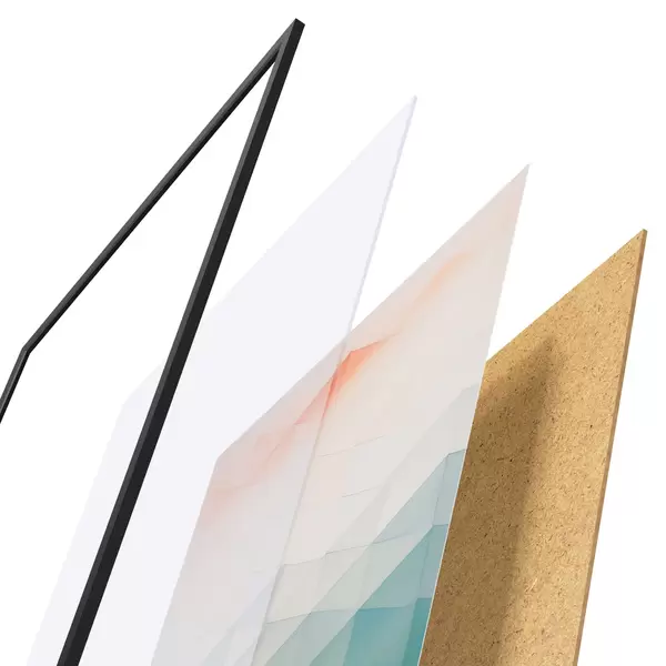 El póster consta de marco, plexiglás, imagen impresa y soporte de aglomerado. El póster puede colgarse inmediatamente en la pared gracias a los soportes de la parte posterior.