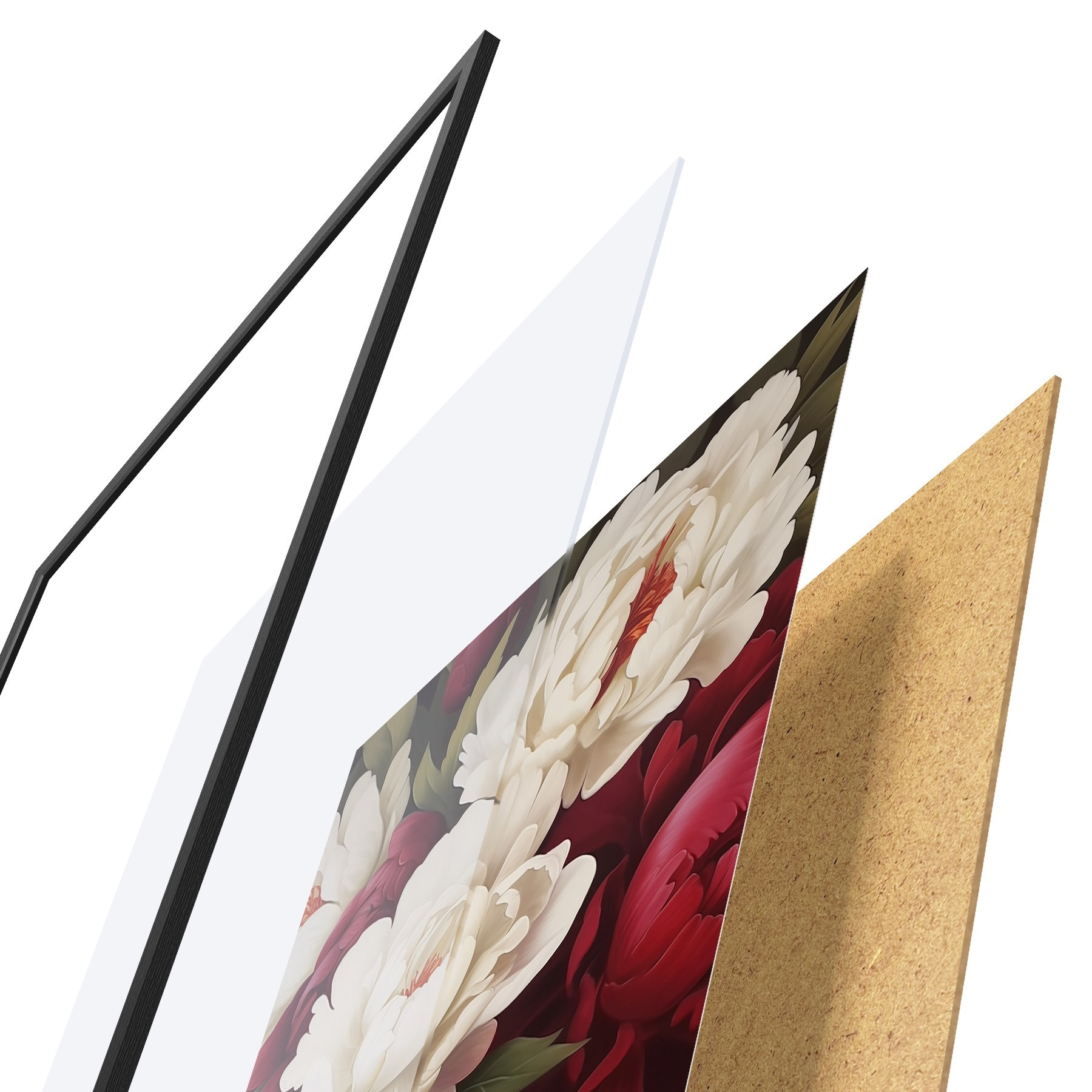 El póster consta de marco, plexiglás, imagen impresa y soporte de aglomerado. El póster puede colgarse inmediatamente en la pared gracias a los soportes de la parte posterior.