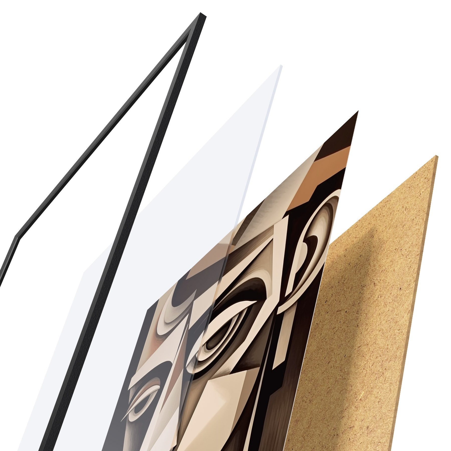 El póster consta de marco, plexiglás, imagen impresa y soporte de aglomerado. El póster puede colgarse inmediatamente en la pared gracias a los soportes de la parte posterior.