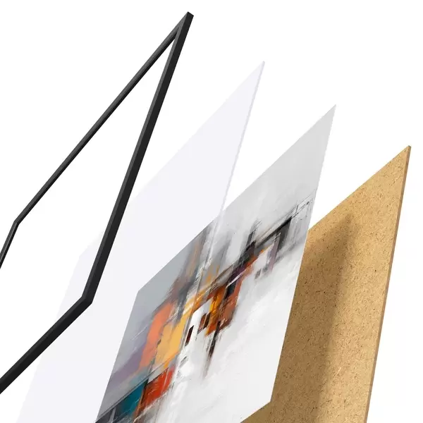 El póster consta de marco, plexiglás, imagen impresa y soporte de aglomerado. El póster puede colgarse inmediatamente en la pared gracias a los soportes de la parte posterior.