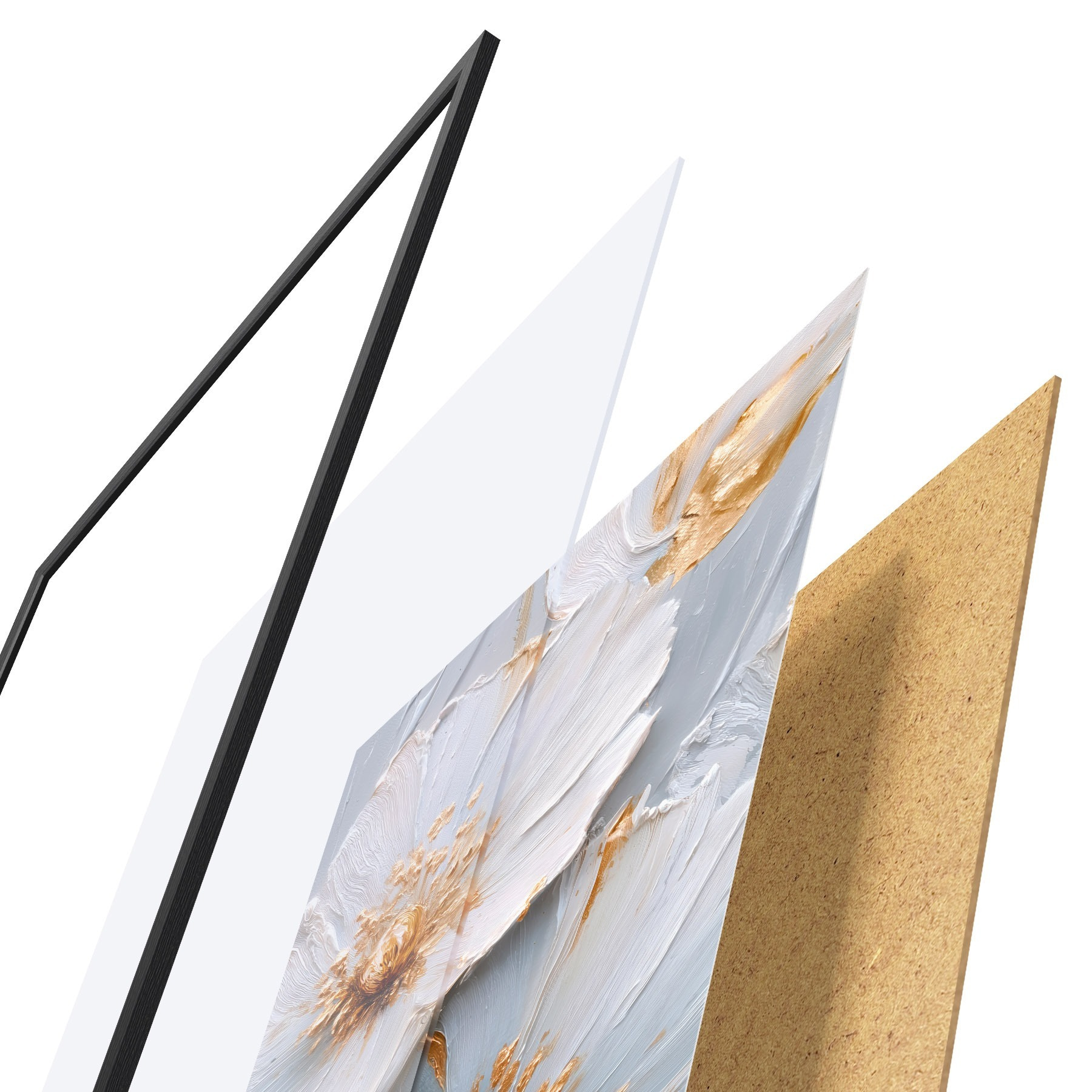 El póster consta de marco, plexiglás, imagen impresa y soporte de aglomerado. El póster puede colgarse inmediatamente en la pared gracias a los soportes de la parte posterior.