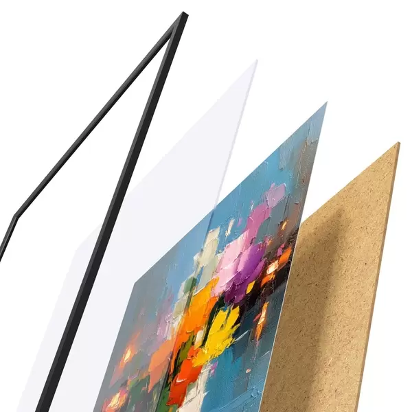 El póster consta de marco, plexiglás, imagen impresa y soporte de aglomerado. El póster puede colgarse inmediatamente en la pared gracias a los soportes de la parte posterior.