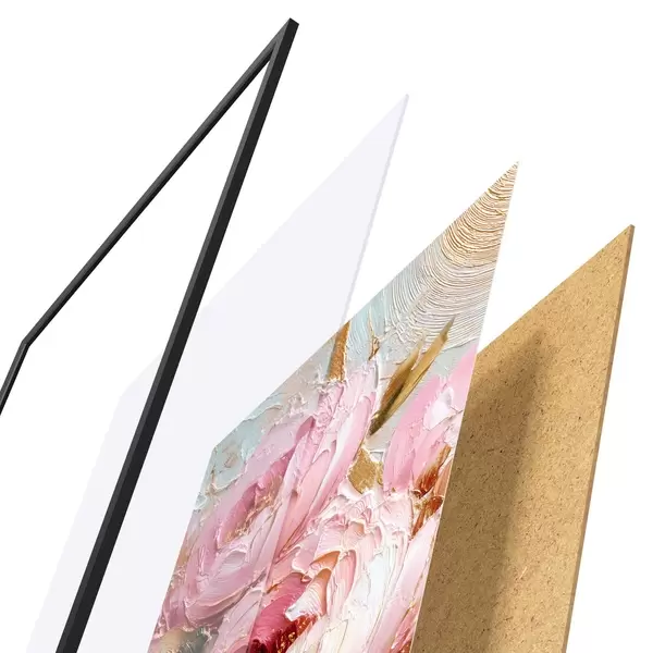El póster consta de marco, plexiglás, imagen impresa y soporte de aglomerado. El póster puede colgarse inmediatamente en la pared gracias a los soportes de la parte posterior.