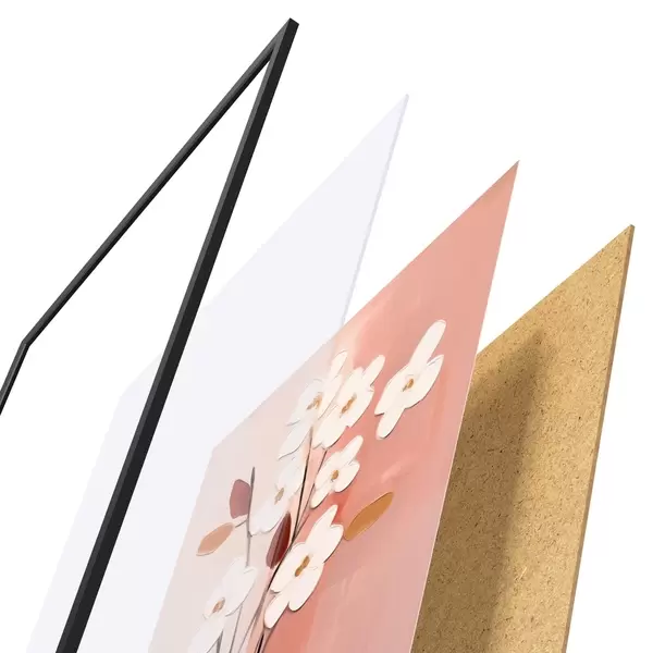 El póster consta de marco, plexiglás, imagen impresa y soporte de aglomerado. El póster puede colgarse inmediatamente en la pared gracias a los soportes de la parte posterior.