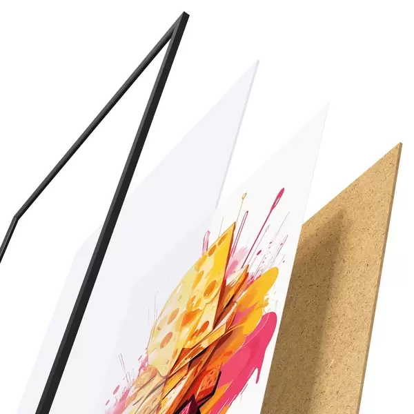 El póster consta de marco, plexiglás, imagen impresa y soporte de aglomerado. El póster puede colgarse inmediatamente en la pared gracias a los soportes de la parte posterior.