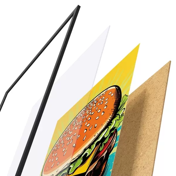 El póster consta de marco, plexiglás, imagen impresa y soporte de aglomerado. El póster puede colgarse inmediatamente en la pared gracias a los soportes de la parte posterior.