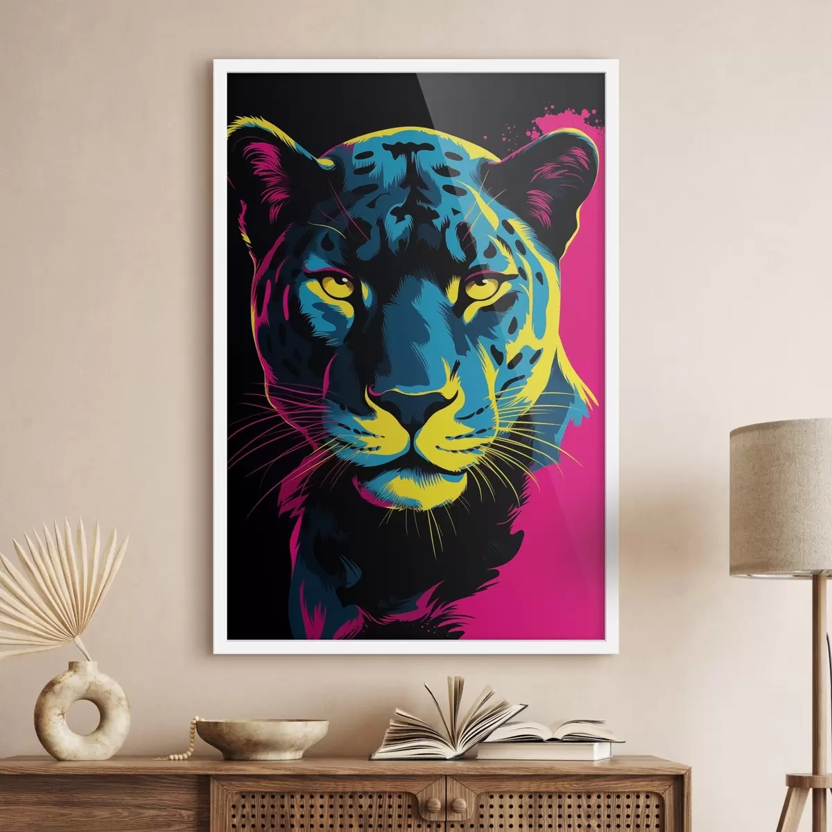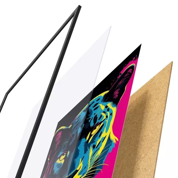 El póster consta de marco, plexiglás, imagen impresa y soporte de aglomerado. El póster puede colgarse inmediatamente en la pared gracias a los soportes de la parte posterior.