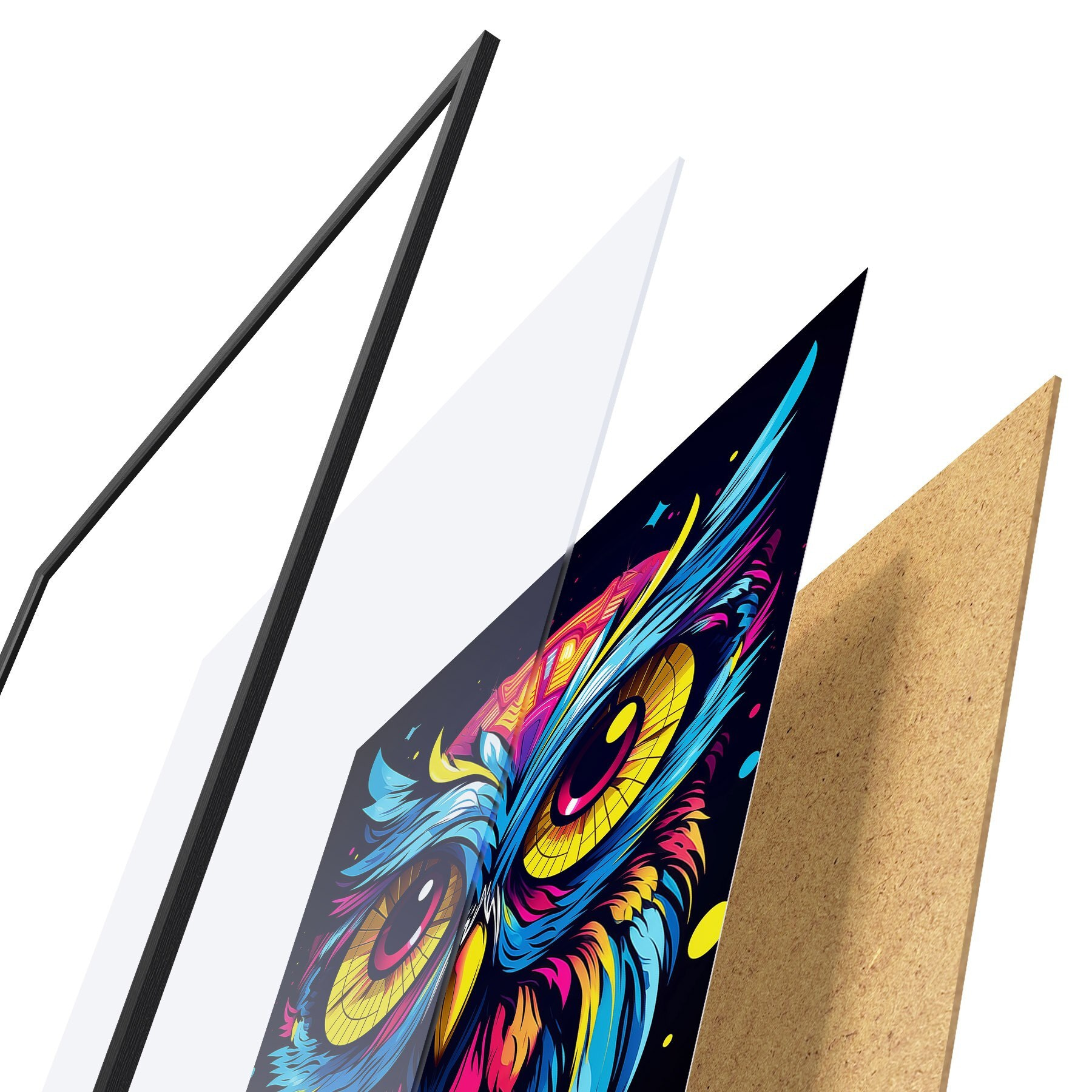 El póster consta de marco, plexiglás, imagen impresa y soporte de aglomerado. El póster puede colgarse inmediatamente en la pared gracias a los soportes de la parte posterior.