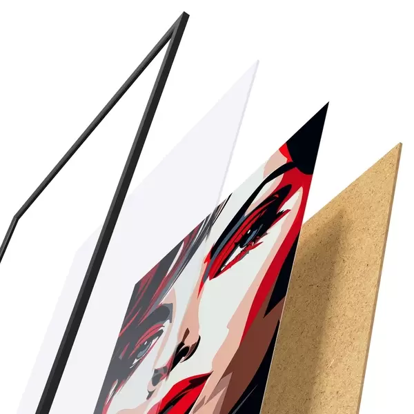 El póster consta de marco, plexiglás, imagen impresa y soporte de aglomerado. El póster puede colgarse inmediatamente en la pared gracias a los soportes de la parte posterior.