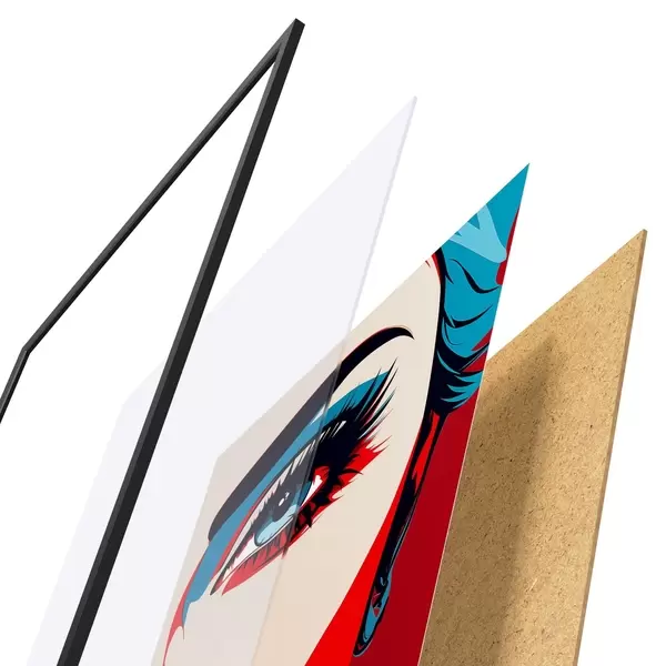 El póster consta de marco, plexiglás, imagen impresa y soporte de aglomerado. El póster puede colgarse inmediatamente en la pared gracias a los soportes de la parte posterior.