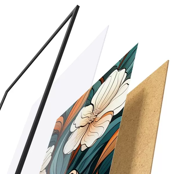 El póster consta de marco, plexiglás, imagen impresa y soporte de aglomerado. El póster puede colgarse inmediatamente en la pared gracias a los soportes de la parte posterior.