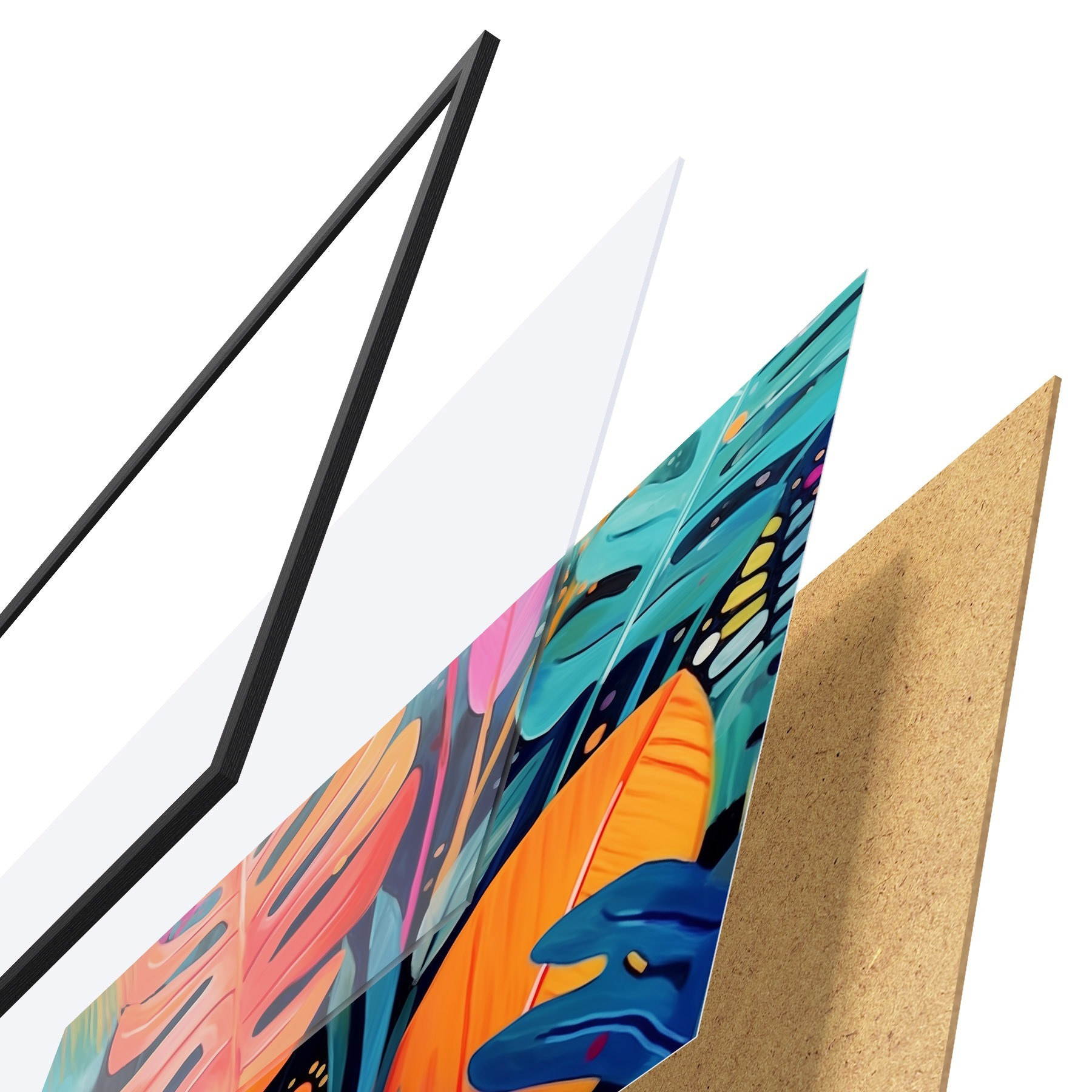 El póster consta de marco, plexiglás, imagen impresa y soporte de aglomerado. El póster puede colgarse inmediatamente en la pared gracias a los soportes de la parte posterior.