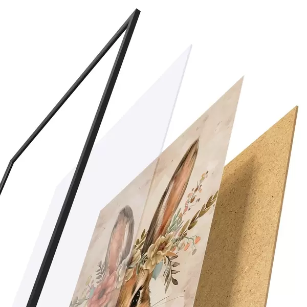 El póster consta de marco, plexiglás, imagen impresa y soporte de aglomerado. El póster puede colgarse inmediatamente en la pared gracias a los soportes de la parte posterior.