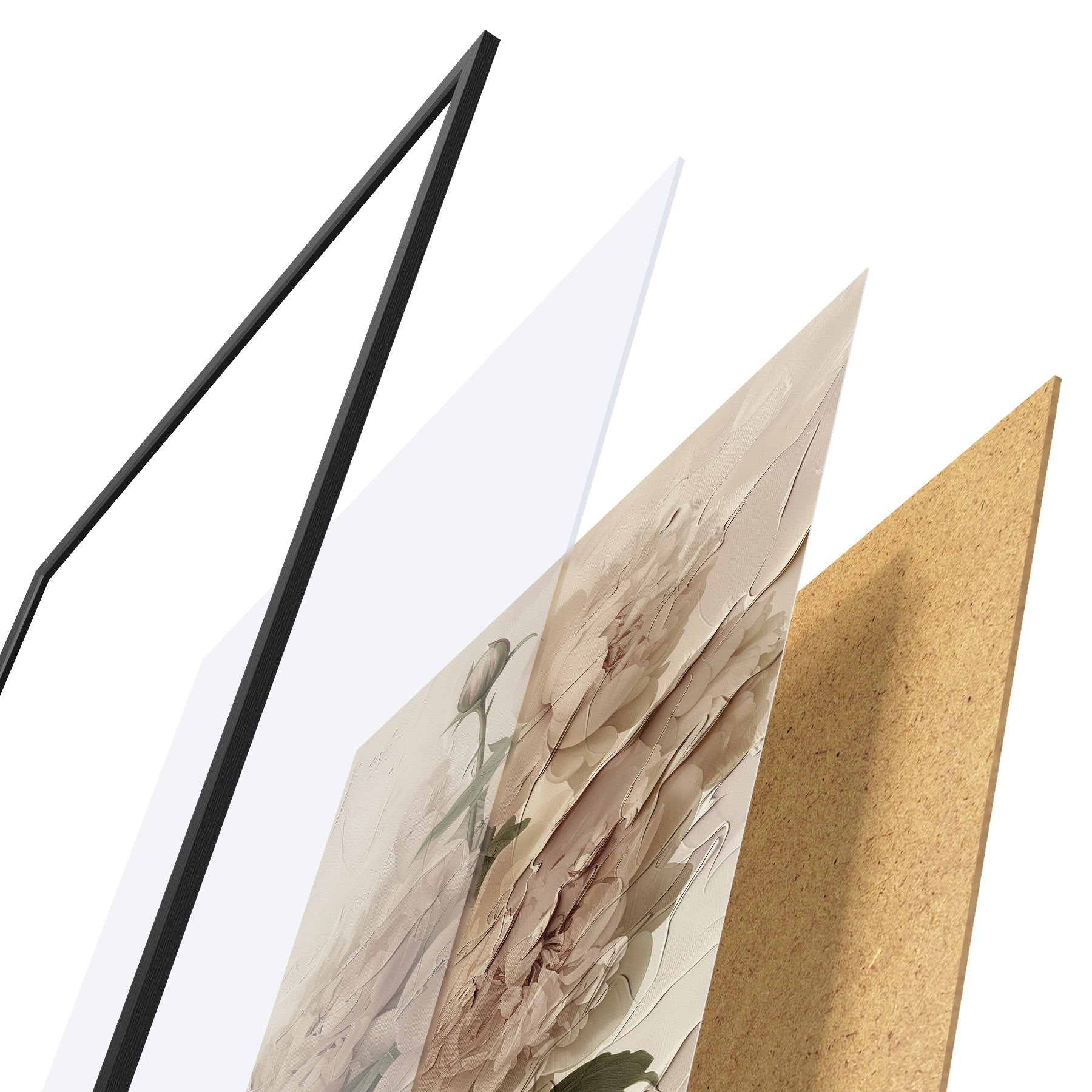 El póster consta de marco, plexiglás, imagen impresa y soporte de aglomerado. El póster puede colgarse inmediatamente en la pared gracias a los soportes de la parte posterior.