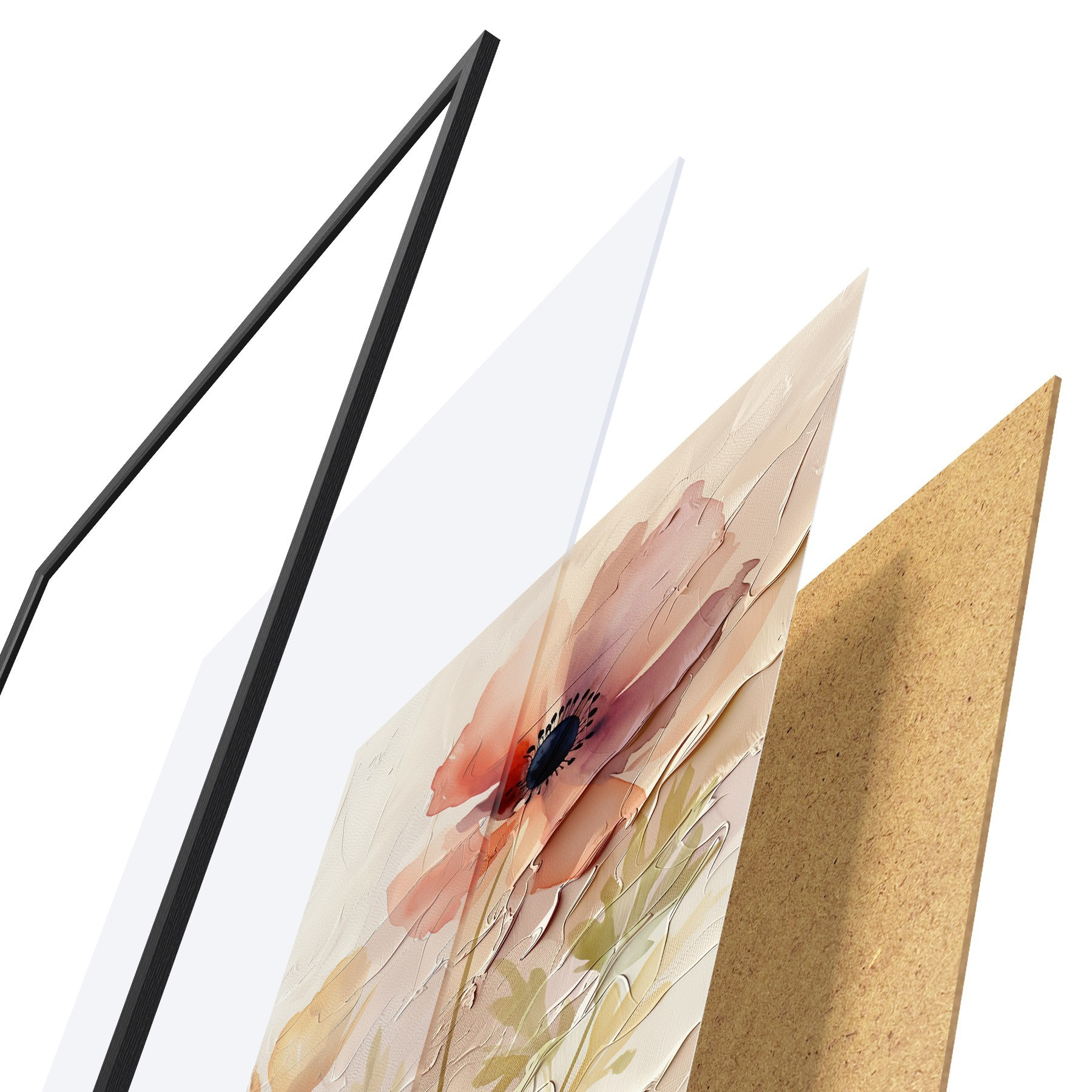 El póster consta de marco, plexiglás, imagen impresa y soporte de aglomerado. El póster puede colgarse inmediatamente en la pared gracias a los soportes de la parte posterior.