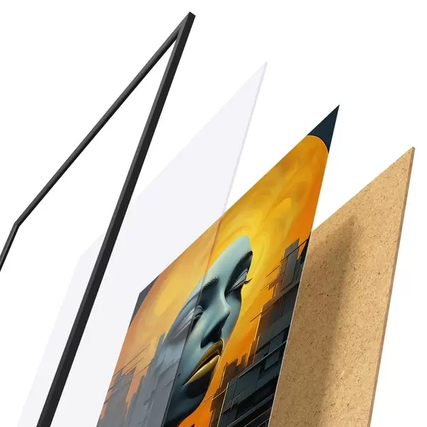 El póster consta de marco, plexiglás, imagen impresa y soporte de aglomerado. El póster puede colgarse inmediatamente en la pared gracias a los soportes de la parte posterior.