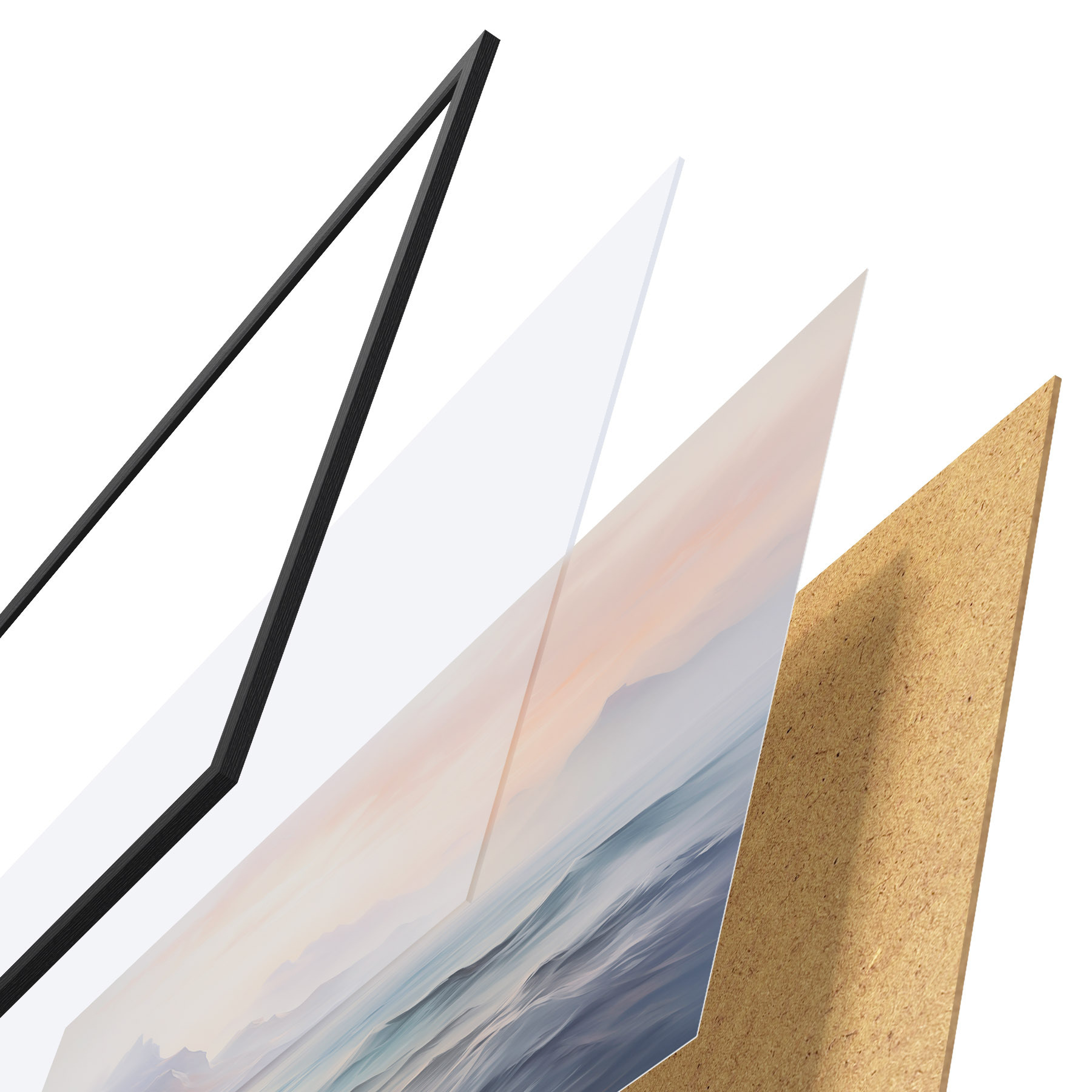 El póster consta de marco, plexiglás, imagen impresa y soporte de aglomerado. El póster puede colgarse inmediatamente en la pared gracias a los soportes de la parte posterior.