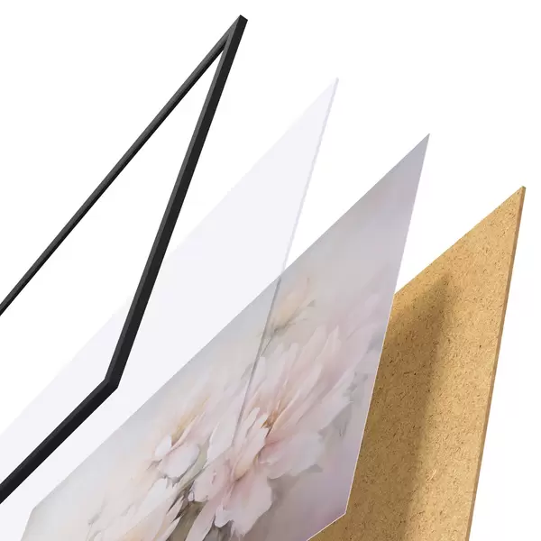 El póster consta de marco, plexiglás, imagen impresa y soporte de aglomerado. El póster puede colgarse inmediatamente en la pared gracias a los soportes de la parte posterior.