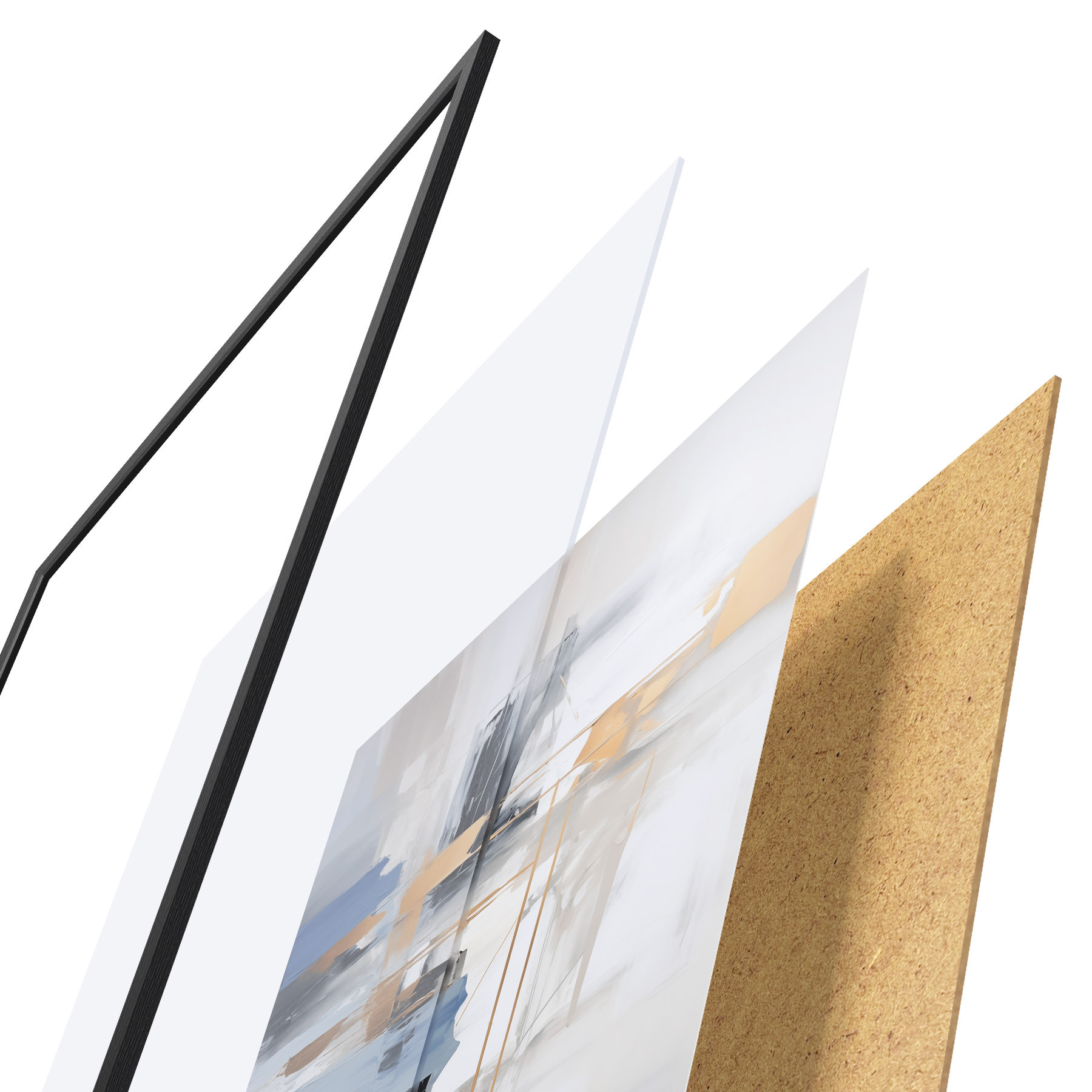 El póster consta de marco, plexiglás, imagen impresa y soporte de aglomerado. El póster puede colgarse inmediatamente en la pared gracias a los soportes de la parte posterior.