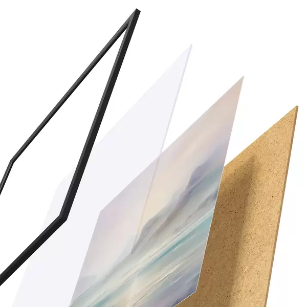El póster consta de marco, plexiglás, imagen impresa y soporte de aglomerado. El póster puede colgarse inmediatamente en la pared gracias a los soportes de la parte posterior.