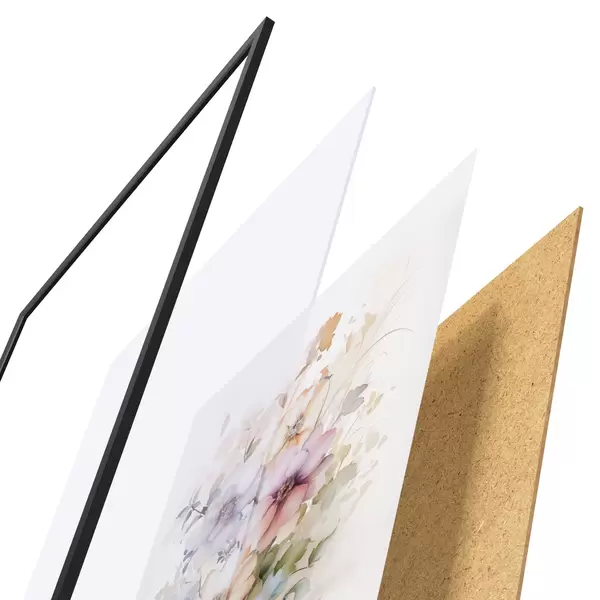 El póster consta de marco, plexiglás, imagen impresa y soporte de aglomerado. El póster puede colgarse inmediatamente en la pared gracias a los soportes de la parte posterior.