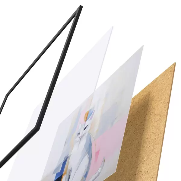 El póster consta de marco, plexiglás, imagen impresa y soporte de aglomerado. El póster puede colgarse inmediatamente en la pared gracias a los soportes de la parte posterior.