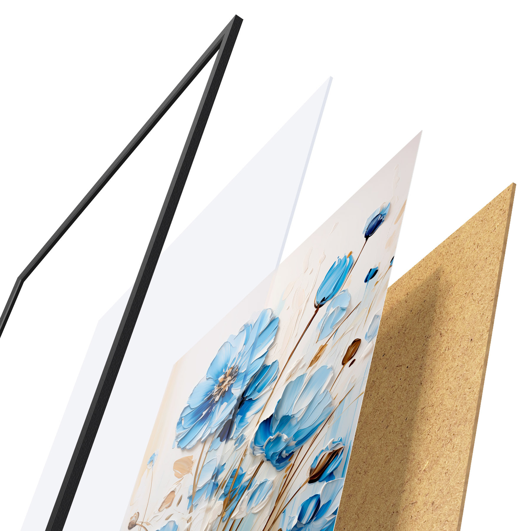 El póster consta de marco, plexiglás, imagen impresa y soporte de aglomerado. El póster puede colgarse inmediatamente en la pared gracias a los soportes de la parte posterior.