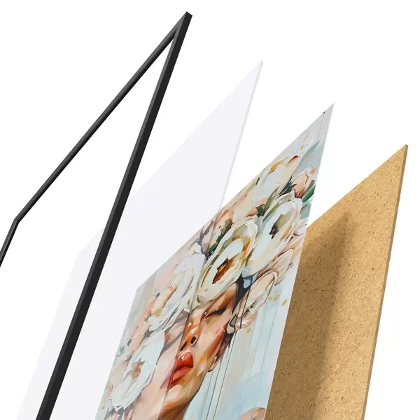 El póster consta de marco, plexiglás, imagen impresa y soporte de aglomerado. El póster puede colgarse inmediatamente en la pared gracias a los soportes de la parte posterior.