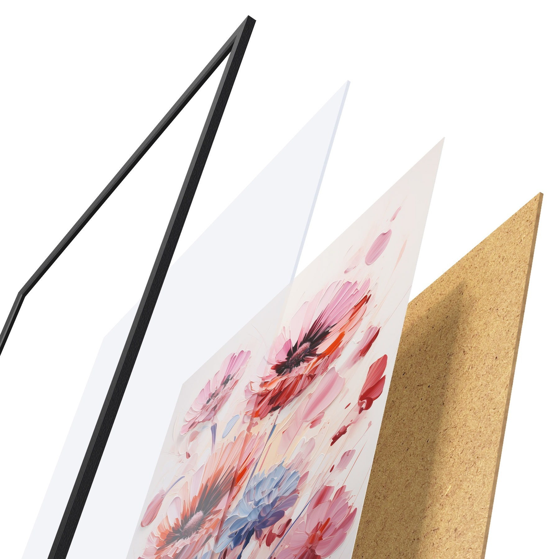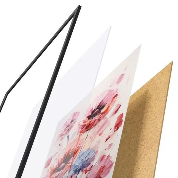 El póster consta de marco, plexiglás, imagen impresa y soporte de aglomerado. El póster puede colgarse inmediatamente en la pared gracias a los soportes de la parte posterior.