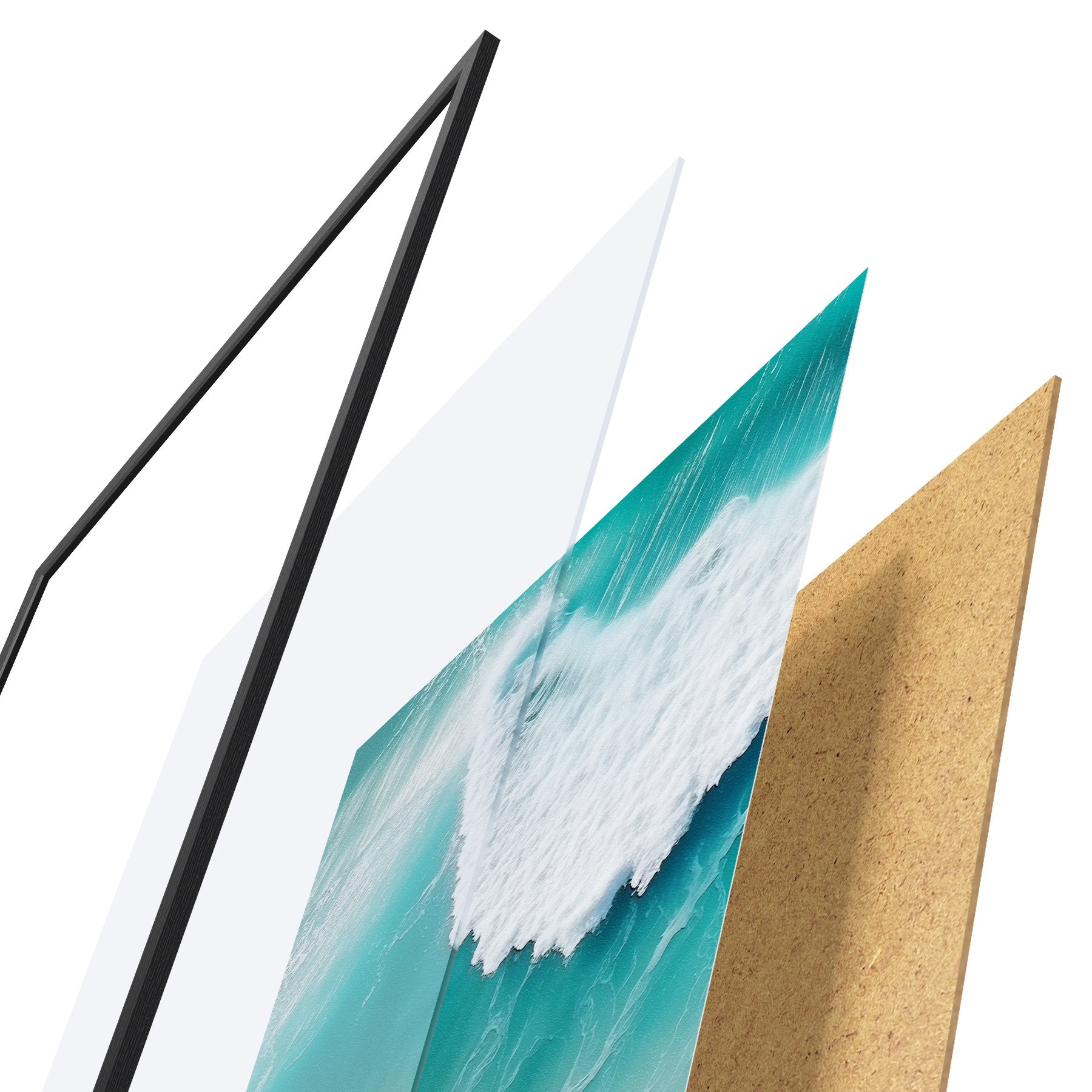 El póster consta de marco, plexiglás, imagen impresa y soporte de aglomerado. El póster puede colgarse inmediatamente en la pared gracias a los soportes de la parte posterior.