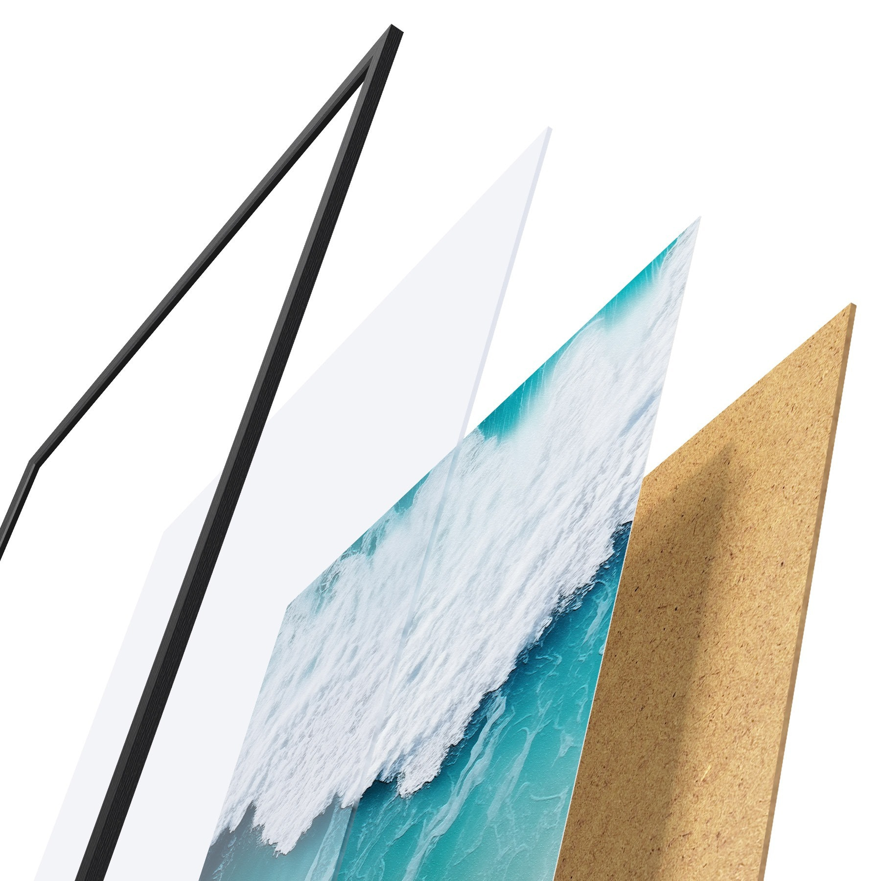 El póster consta de marco, plexiglás, imagen impresa y soporte de aglomerado. El póster puede colgarse inmediatamente en la pared gracias a los soportes de la parte posterior.