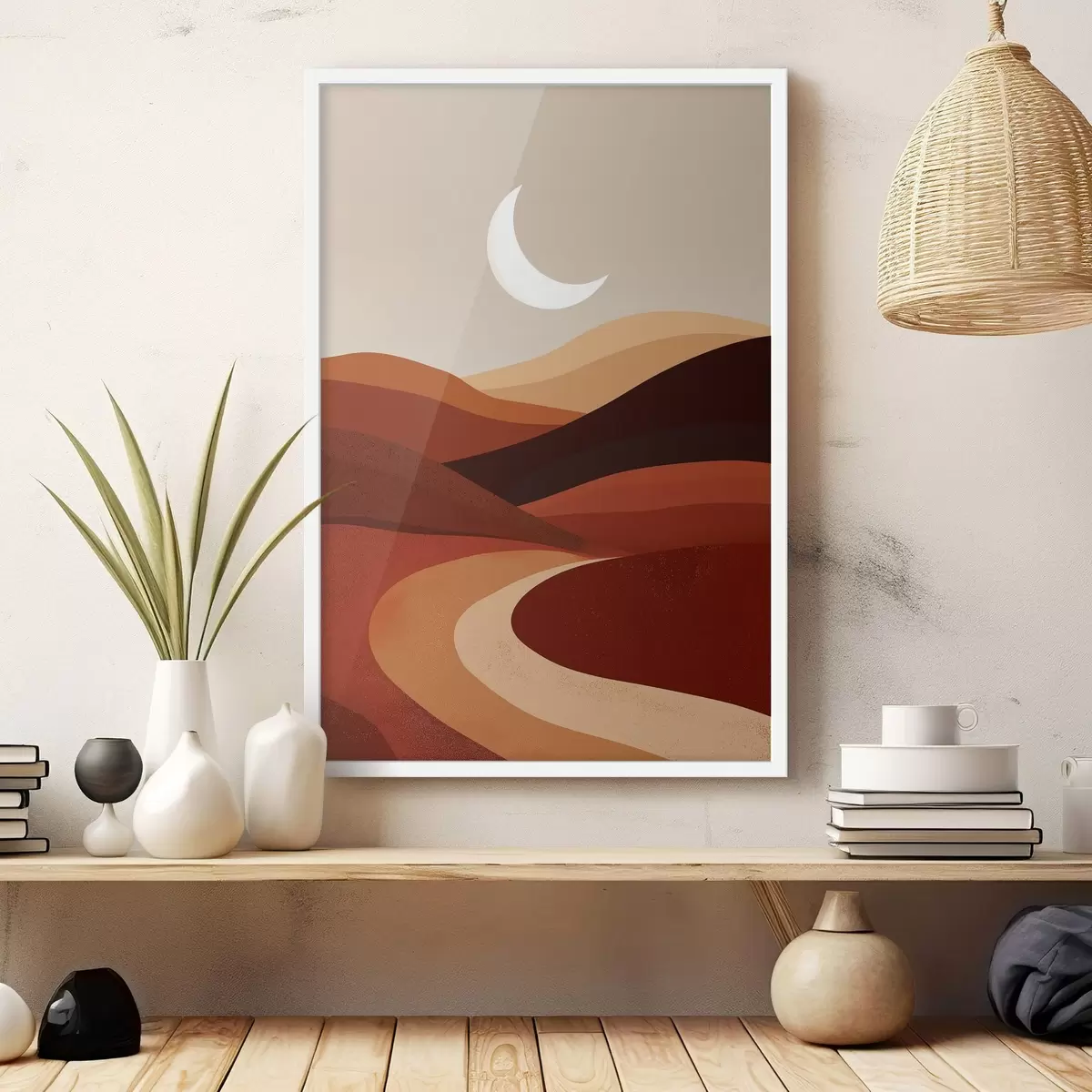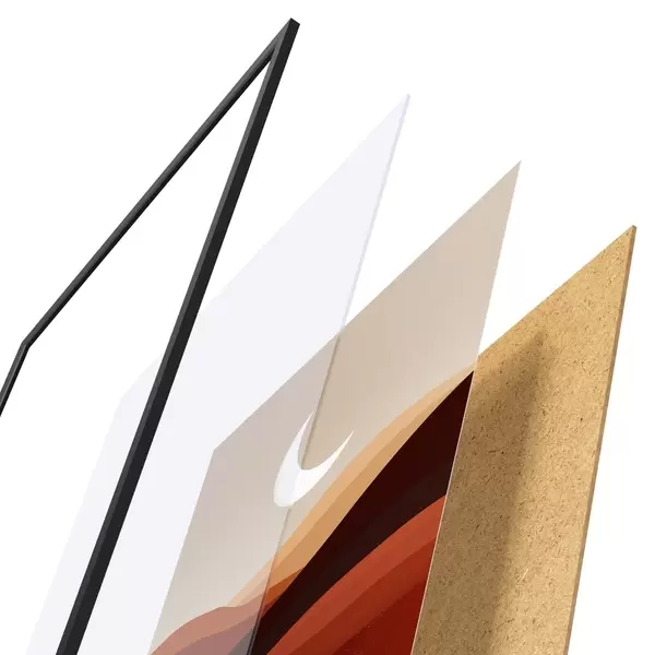El póster consta de marco, plexiglás, imagen impresa y soporte de aglomerado. El póster puede colgarse inmediatamente en la pared gracias a los soportes de la parte posterior.