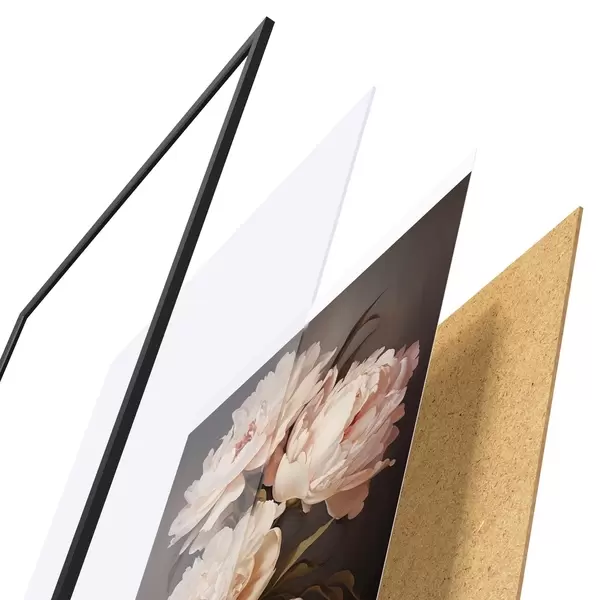El póster consta de marco, plexiglás, imagen impresa y soporte de aglomerado. El póster puede colgarse inmediatamente en la pared gracias a los soportes de la parte posterior.
