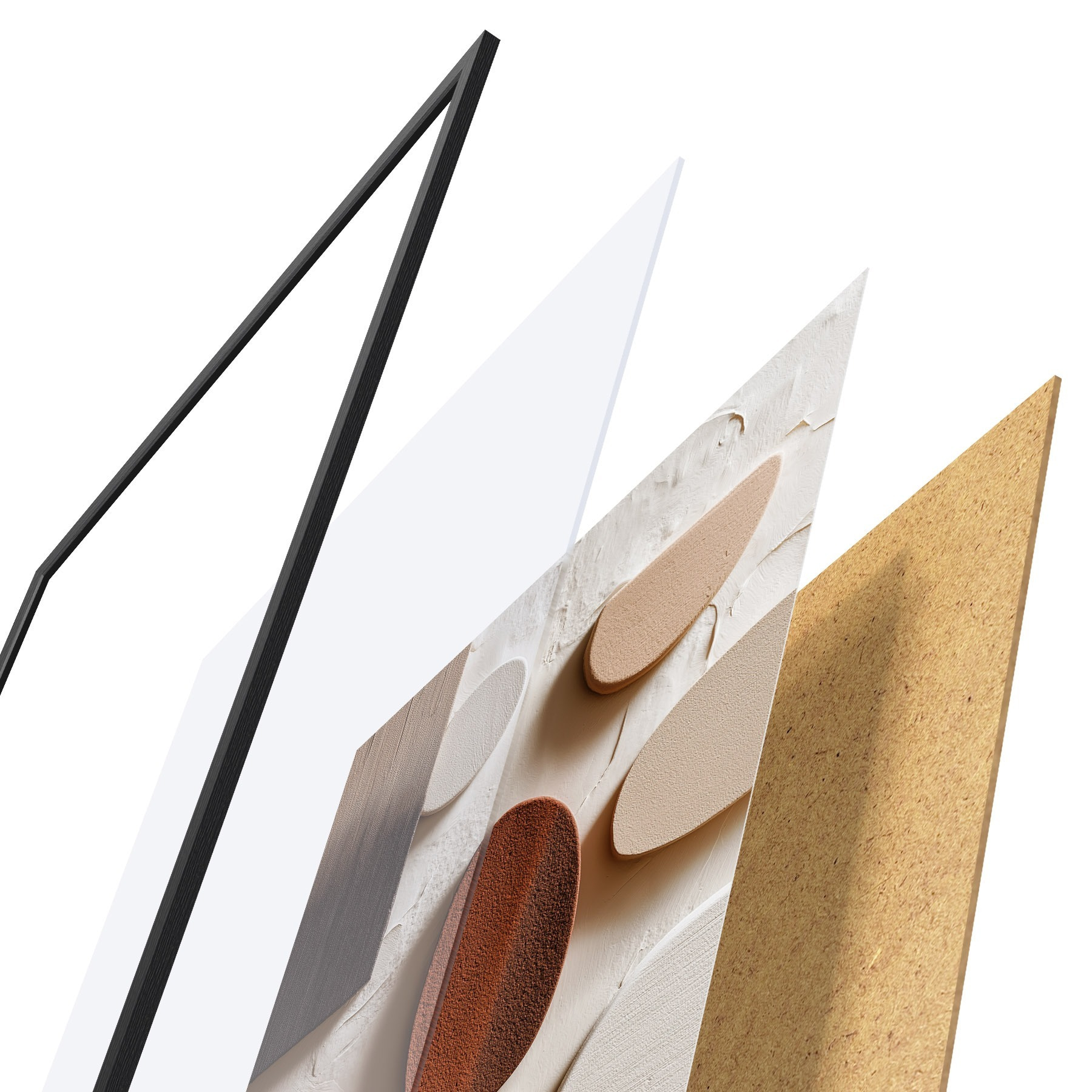 El póster consta de marco, plexiglás, imagen impresa y soporte de aglomerado. El póster puede colgarse inmediatamente en la pared gracias a los soportes de la parte posterior.