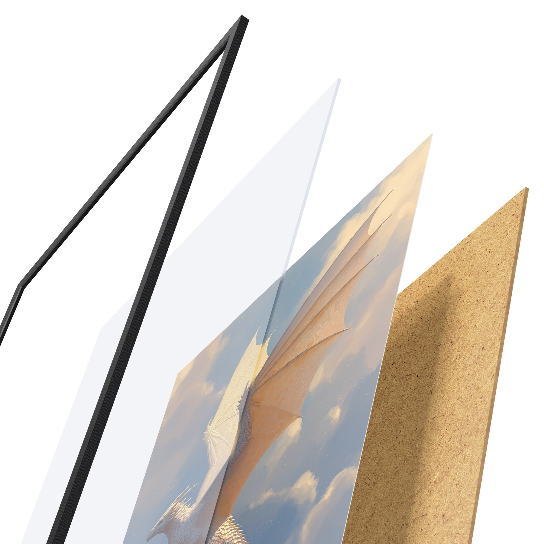 El póster consta de marco, plexiglás, imagen impresa y soporte de aglomerado. El póster puede colgarse inmediatamente en la pared gracias a los soportes de la parte posterior.