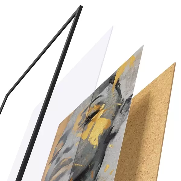 El póster consta de marco, plexiglás, imagen impresa y soporte de aglomerado. El póster puede colgarse inmediatamente en la pared gracias a los soportes de la parte posterior.