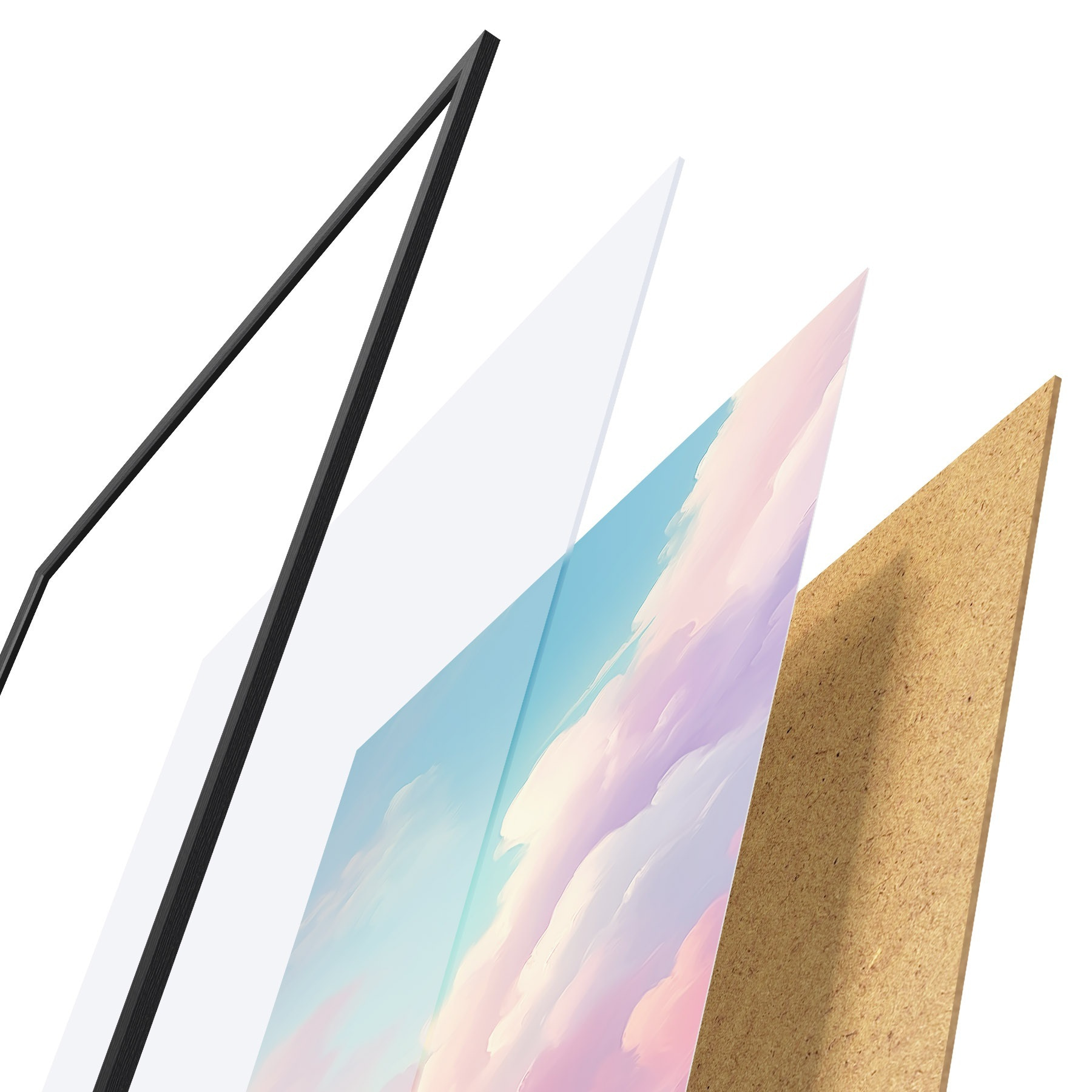 El póster consta de marco, plexiglás, imagen impresa y soporte de aglomerado. El póster puede colgarse inmediatamente en la pared gracias a los soportes de la parte posterior.