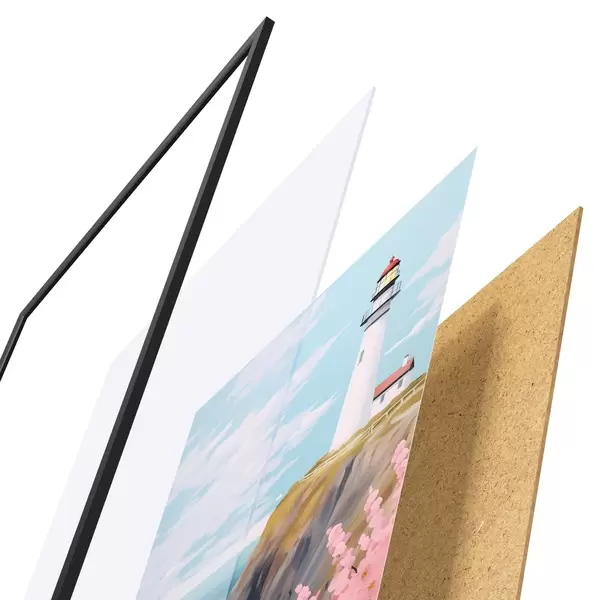 El póster consta de marco, plexiglás, imagen impresa y soporte de aglomerado. El póster puede colgarse inmediatamente en la pared gracias a los soportes de la parte posterior.