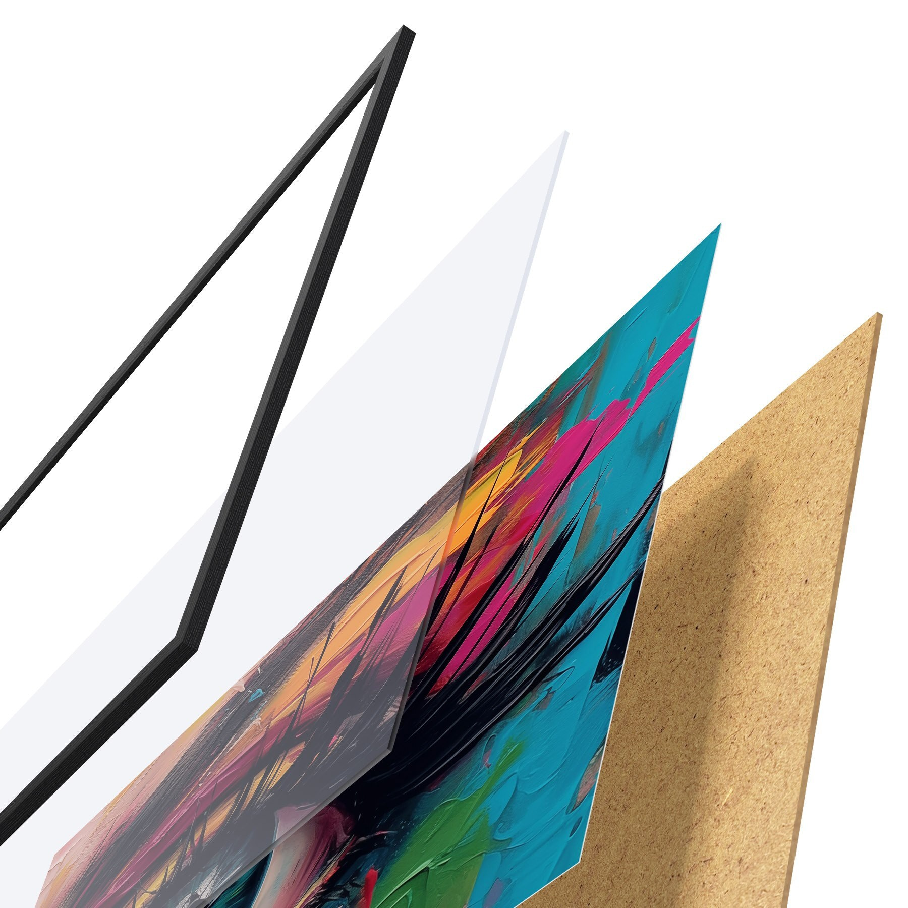El póster consta de marco, plexiglás, imagen impresa y soporte de aglomerado. El póster puede colgarse inmediatamente en la pared gracias a los soportes de la parte posterior.