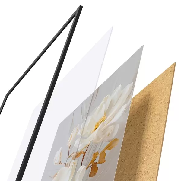 El póster consta de marco, plexiglás, imagen impresa y soporte de aglomerado. El póster puede colgarse inmediatamente en la pared gracias a los soportes de la parte posterior.